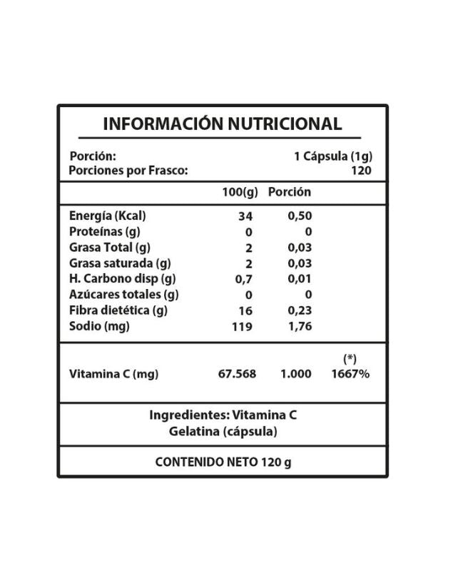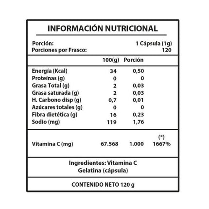 Vitamina C 1000 mg, 120 caps. Vibralab, la vitamina c ayuda a la absorción del hierro, reparar y mantiene el cartílago, los huesos y los dientes, sanar heridas y formar tejido cicatricial. Leer más...