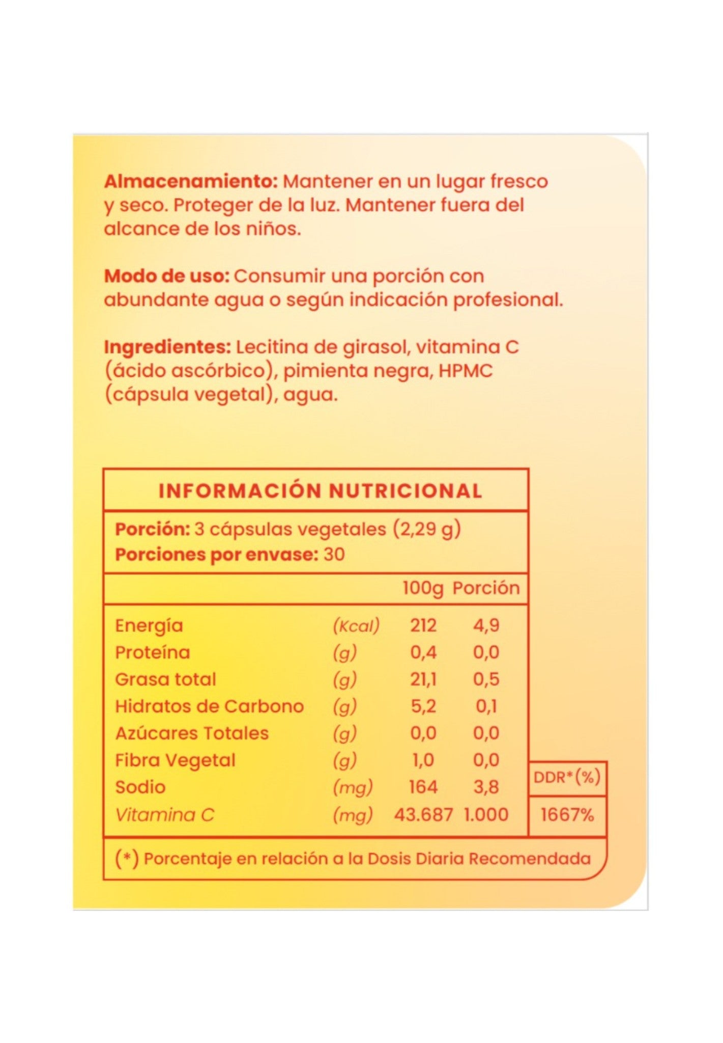 Ingredientes: Lecitina de girasol, vitamina C (ácido ascórbico), pimienta negra, dióxido de silicio, HPMC de la cápsula, agua.