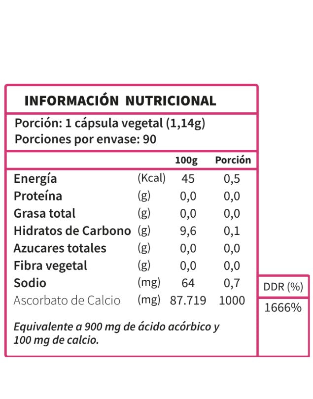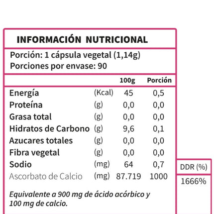 Ingredientes: Vitamina C (ascorbato de calcio), HPMC de la cápsula, agua