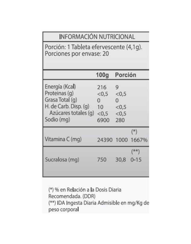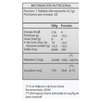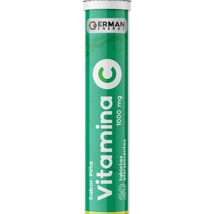 Vitamina C sabor piña, 1000 mg, 20 tabletas. German Energy. Suplemento alimentario de vitamina C con sabor a piña en formato de tabletas efervescentes. Tiene como principal función colaborar con el reforzamiento del sistema inmune y participar en la síntesis de colágeno, por lo que contribuye con la acción de las defensas del sistema inmune y ayuda a mantener una mayor elasticidad de la piel.