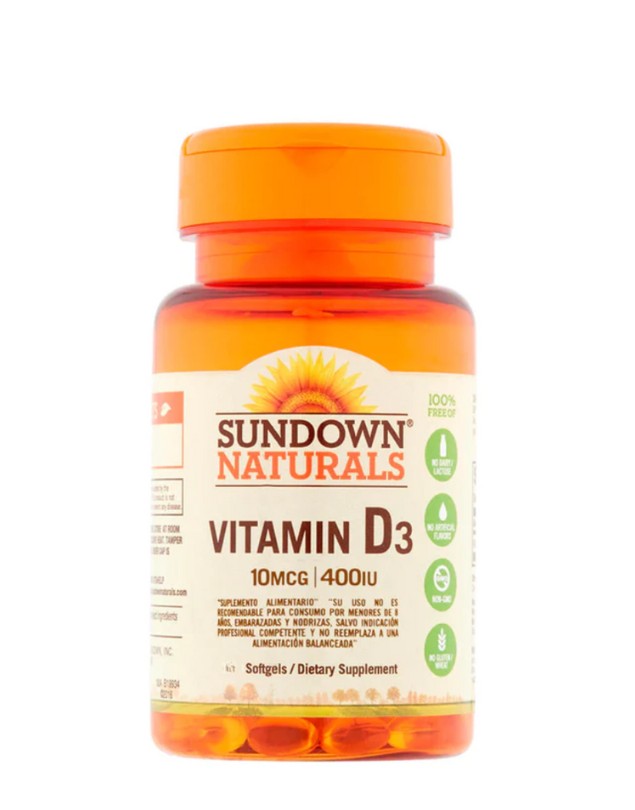 Vitamina D3 400 IU, 100 soft. Sundown. La exposición solar favorece la producción de Vitamina D, por lo tanto la falta de exposición a la luz solar puede reducir los niveles de vitamina D en el organismo, sobretodo en épocas de invierno; motivo por el cual es fundamental complementar la ingesta de Vitamina D con algún suplemento. La Vitamina D, fortalece la salud del sistema inmune y contribuye a mantener los huesos y dientes fuertes. También mejora la absorción de Calcio y Fósforo.