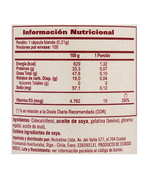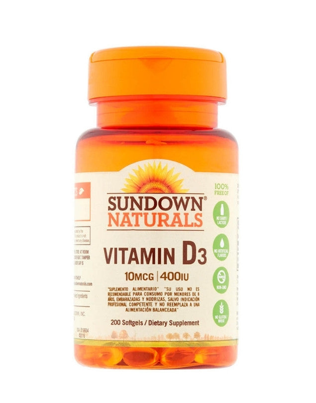 Vitamina D3, 400 UI, 200 softgel, marca Sundown. La exposición solar favorece la producción de Vitamina D, por lo tanto la falta de exposición a la luz solar puede reducir los niveles de vitamina D en el organismo, sobretodo en épocas de invierno; motivo por el cual es fundamental complementar la ingesta de Vitamina D con algún suplemento. La Vitamina D, fortalece la salud del sistema inmune y contribuye a mantener los huesos y dientes fuertes. También mejora la absorción de Calcio y Fósforo.