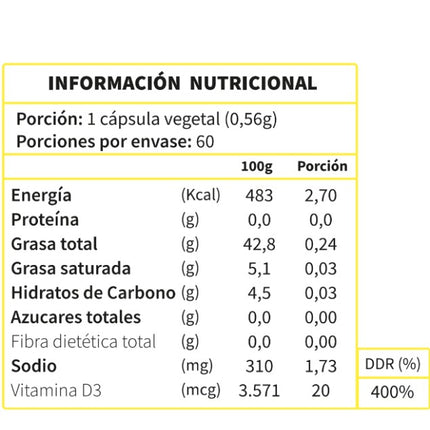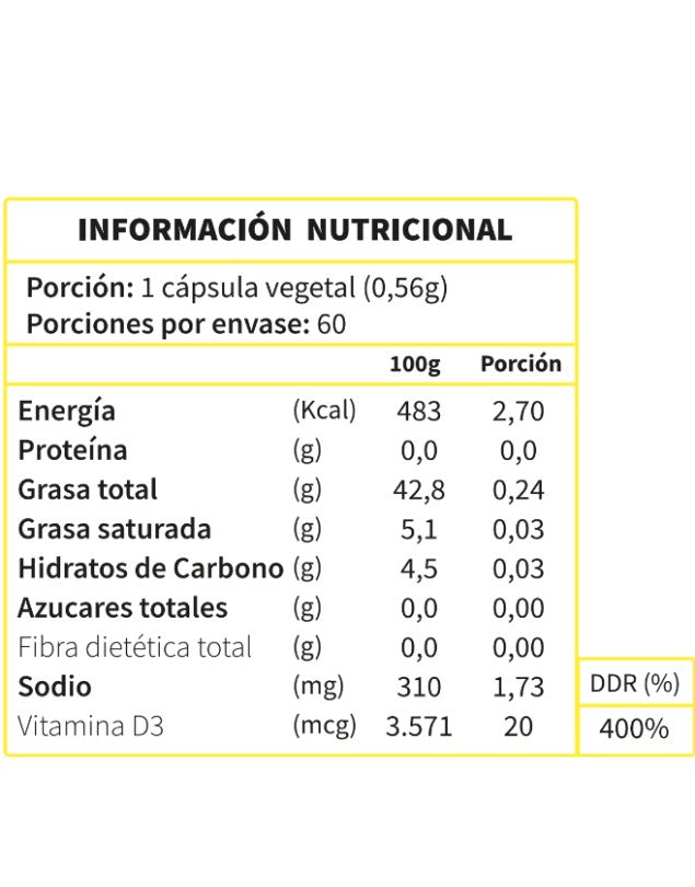Ingredientes: Lecitina de girasol (fosfolípidos), vitamina D3 (colecalciferol), HPMC de la cápsula, agua.