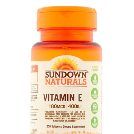 Vitamina E 400 IU 180 mg, 200 softgels. Sundown. La vitamina E es un poderoso antioxidante que ayuda a combatir los radicales libres que se producen a diario en el organismo por diversos factores como la contaminación, rayos UV que provocan daño celular y envejecimiento prematuro. Leer más...